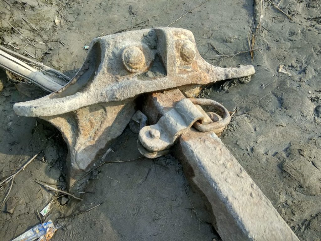 The archaeological expeditions in Dhubri have also highlighted the presence of kingdoms and empires that once flourished under various rulers. The historical monuments, architectural remnants and buildings found in the region describe the region as a rich repository of settlement of various rulers. In the month of October, 2019 a new archaeological discovery was made on the riverbed of Brahmaputra in the Majerchar river block, 11 kms from Dhubri town, when a group of local boys while having a leisurely time swimming and sporting in the river accidentally bumped into a hard object. When pulled out from under two metre of sediment, this hard object that enticed the gathered locals at the site appeared to be an absolute unit of large sized iron Anchor of ship wreckage. Twenty people came together to securely pull out this heavy weight from underneath the water bed. The iron chains attached to the anchor was found absorbed in the hump of sand dunes on its bank. The weight of the anchor made it impossible to retrieve the end part of the chain with bare hands, also, unavailability of necessary mechanical equipment and expertise was another factor to consider. On my second visit to the site in the month of November the anchor was found lying abandoned at the river bank with the chains still attached and buried on the sand dunes. Nevertheless, this discovery has opened up a new chapter in the history of navigational activity that took place in the region during the 16th century and onwards. The experts revelling in this discovery are of the opinion that the iron anchor must be of a large ship that went down or must have been abandoned for reasons unknown. Since Dhubri was a major river port at the time of the British rule, spotting such vessels was not an unusual sight. In addition, it has been further speculated that it may be a part of the vessel used by the Armenians, whereas, to some, it might be from one of the many passenger steamers that the British used to ply. Personal observation of the anchor indicated signs of wider possibility of finding more behind the buried iron chains on the north side. The direction of the anchor with the attached chains suggests for a possible finding of the ship wreckage some 40 metres away from the anchor, only if excavation is carried out. However, from such observations nothing could be ascertained until deeper study and research is propounded. Since Dhubri is prone to destructive floods every year and the earthquake of 1951 left major impact on the course of river systems and the riverbeds, therefore an in-depth research, investigation and analysis into this finding could lead to a fresh clue in unfolding of many new discoveries.