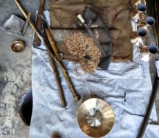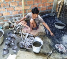 The technology involved in making the objects is traditional and simple. The main tools are anvils of different sizes locally known as balmuri, chatuli and akue , hammers, pincers, flies, chisels and some minor equipment. Locally they are called Dulari, Gasha, Saria, Piri, Khanta (an iron instrument use for polishing the bell metal products), and Pocker etc. The other raw materials are polishing materials, clay, jute fiber, rice bran, mustard oil, Charcoal, Borax, Zinc, shalpatra etc. No machinery is used in the process and from creating the mould to the final polishing, everything is done manually.