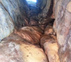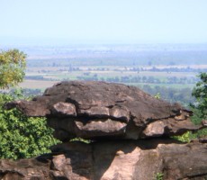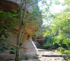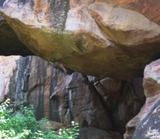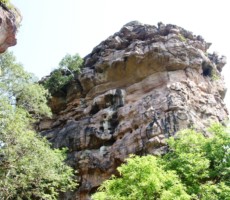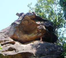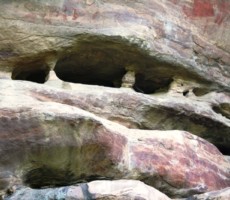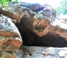 The Rock Shelters of Bhimbetka are in the foothills of the Vindhya range on the southern edge of the Central Indian plateau. It is a group of rock shelters, part of craggy sandstone formations, rising over 100 metres above the Deccan traps amidst the Ratapani wildlife sanctuary .Within massive sandstone outcrops, the five clusters of natural rock shelters, display paintings that appear to date from the Mesolithic period right through the Historical period. The outcrops with painted rock shelters run east-west for a length of more than 8 kms. Its eastern and southern slopes are steep, while northern and western slopes are gentle. The hill is topped by a chain of dissected vertical tors rising sometimes upto twenty metres high that are eroded remanants of a former continuous rock mass.