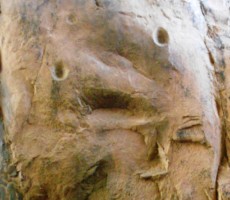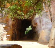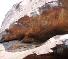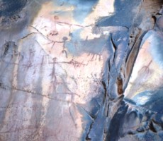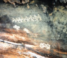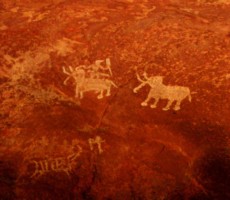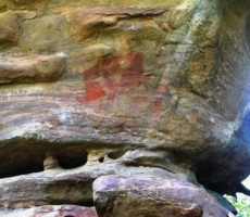 In another cave drawings of a horseman and a soldier are seen higher up. In the depression on the rock face below, the elephants and a bull is depicted, wounded by the arrow of a hunter.