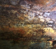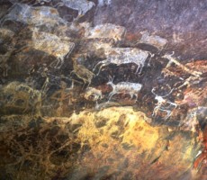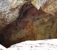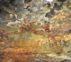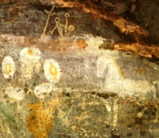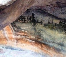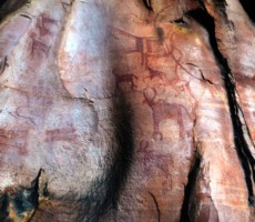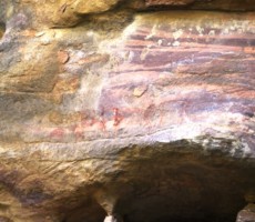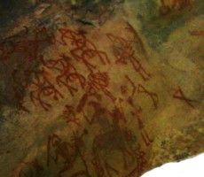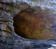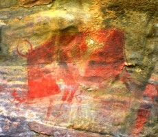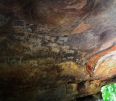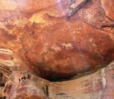 The painting composition portraying bulls, buffaloes, deer, antelopes, a peacock, a tiger, a left hand print of a child, and an unfinished basket like object depicted over older faded lines are the most attractive depictions in one of its shelters. Also, there are a number of human and animal figures depicted in line drawings. Besides, the cave also has a number of cupules depressions on stone, which are the man’s earliest manifestation of creativity, probably associated with Lower Palaeolithic period.