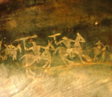 Bhimbetka displays paintings that appear to date from Mesolithic period right through the Historical period. The paintings shows gradual development of social-cultural life of mankind. The rock paintings of early phase comprises human and animal figures in line drawings. The rock paintings of Mesolithic period are demonstrated by hunting scenes. Most of the hunting scenes belong to the earlier phase confined to Mesolithic and Chalcolithic periods whereas horse riding, elephant riding and battle scenes which appear more refined are associated with Historical period.