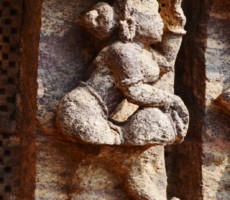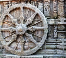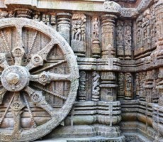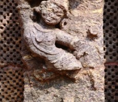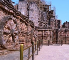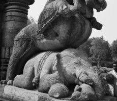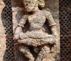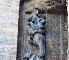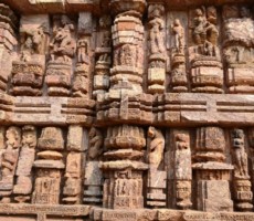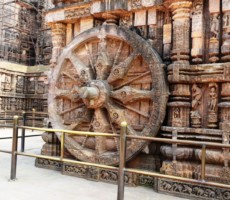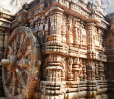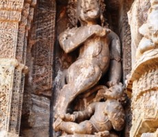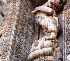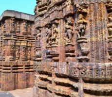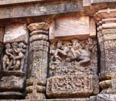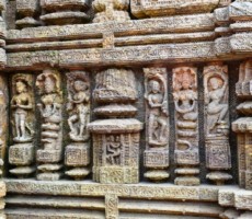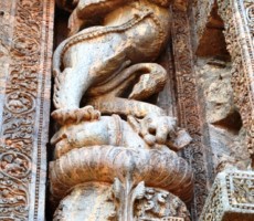 The Gajasimha or main entrance is guarded by two stone lions crushing elephants and leads to the intricately carved Nritya mandapa or dancing hall. Steps, flanked by straining horses, rise to the still-standing jagamohan. Behind is the spineless deul with its three impressive chlorite images of Surya aligned to catch the sun at dawn, noon and sunset. The base and walls present a chronicle in stone of Kalinga life, a storyboard of life and love in a continuous procession of carvings. Many are in the erotic style for which Konark is famous and include entwined couples as well as solitary exhibitionists. Sometimes they’re minute images on the spoke of a temple wheel; at other times they are larger –than-life-sized figures higher up the walls.