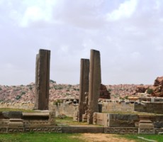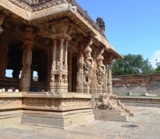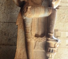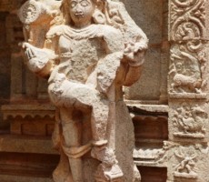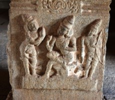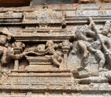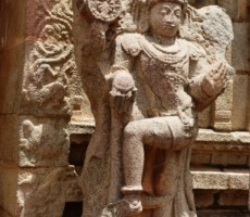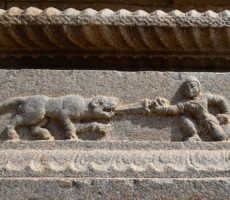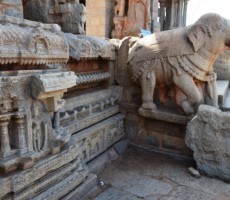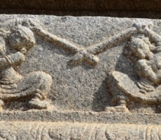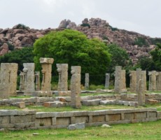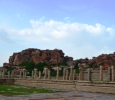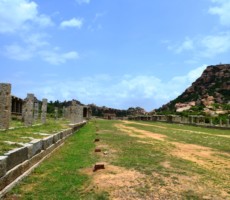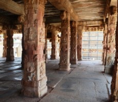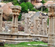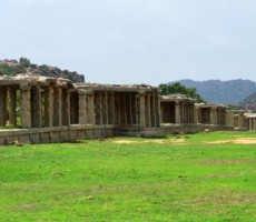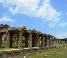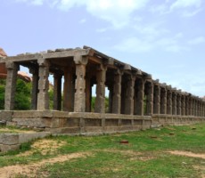 Apparently it was the two rows of mandapas where the trade of precious stones and diamonds was carried on. This is also called the ‘Sule Bazaar’. The kalyanamandapa in the Achyutharaya temple is similar to that in the Vittalaswamy temple. There are twin pillars in the temple carved from a single rock. The pillars that support the temple doors are on the base which comprises carvings relating to dashavatara figures, the ten incarnations of lord Vishnu. On the base, elephants, horses ,Arab traders and other foreigners figures are carved in natural and beautiful style.