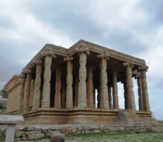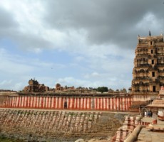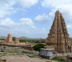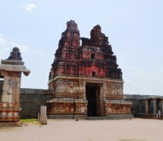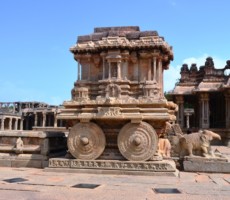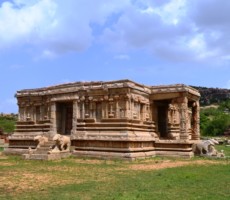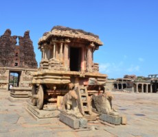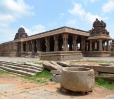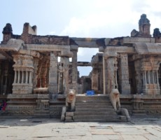The Vitthala temple, represent the highest watermark of the Vijayanagara style of art and architecture. Vitthala is the Krishna aspect of lord Vishnu. It is one of the largest temples of that period, built under the patronage of Devaraya II (1422-46 ad.). Substantial portions of the present structure were added during Krishnadevaraya’s (1509-1529 ad.) reign. The hundred pillared mandapa (pavilion) to the southwest of main temple and the eastern and northern gateways carved with depictions of Vishnu and his other forms, are attributed to Krishnadevaraya and his queens. The temple is built on a sculptured ornate plinth, the composite pillars of the sabhamandapa (congregation hall) are massive, hewn out of single granite blocks, which are designed as clusters of slender pillars. Some of these, when tapped gently, produce musical notes. To the northern bay of the sabhamandapa is the Narasimha mandapa, where a pillar has the sculpture of a yogavarada Narasimha and various other forms. The stone chariot, at the entrance, a reproduction of a processional wooden chariot, is perhaps the most stunning achievement, typical of the Vijayanagara period. It houses an image of Garuda, the vehicle of lord Vishnu. The Vijayanagara kings seem to have been inspired by the sun temple at Konark, Orissa. . Experts opine that they might have built this monolithic stone in place of Garuda. On this stone car figures of soldiers, hunters, riders, Portuguese, Arabs and Persians have been carved.