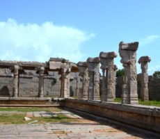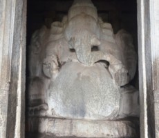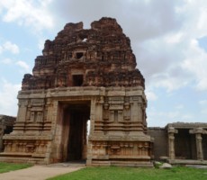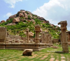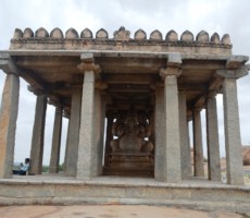 On the Hemakuta hill there are many temples and a Jain Temple. On the east-south direction lies a big temple called the Kadlekalu Ganapathi temple. The monolithic Kadlekalu Ganesha is so called, for the closeness appearance, of the shape of its belly to the unsplit Bengal – Gram. The sculpture is carved out of a single boulder in situ, and stands 4.5 mts high. Dated to the 15th century, the seated Ganesha sculpture is four armed and bears in each hand a tusk, goad, noose, and a bowl of sweetmeats, respectively. It is enshrined in a simple sanctum with a vestibule and an open ornate pillared pavilion in front. The tall slender pillars are sculpted with depictions of various Hindu Gods and Goddesses.