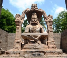 This magnificent monolithic Lakshmi Narasimha, the fourth incarnation of lord Vishnu stands at a height of 6.7 mts. It is one of the finest examples of Vijayanagara sculpture. Narasimha is seated on the giant coils of adishesha, the sacred guardian snake of Vishnu. its seven hoods acting as a canopy arched by a kirtimukha torana in front. the roof of the chamber enshrining the statue is missing which has led to much weathering and damage to this monolithic sculpture. The four arms of the statue with its various attributes have been broken and the seated figure of his consort Lakshmi on his left lap is missing. The face too has been damaged which misled people into believing that it was the ugranarasimha or angered Narasimha. The presence of the right hand of the gods embracing the lord at the back is proof of it being that of Lakshmi Narasimha. The statue was consecrated by priest Krishna Bhatta at the behest of Krishnadevaraya in 1528 ad as per the lithic record nearby.