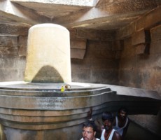 This is 3 mts. high large Shiva linga is also a monolith similar to Lakshmi Narasimha, carved out of one rock in situ, the pedestal, remains in bed of water, within a small damaged shrine. Referred to as the Badavilinga, legend has it, that it was commissioned by a poor woman. The Shiva linga has a fairly large circular pedestal (yone pitha), drawing into a pranala (outlet). The central median line (somasutra) has the three-eye mark, drawn in line carving. The sanctum chamber that houses it, is a large stone, brick and mortar structure.