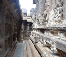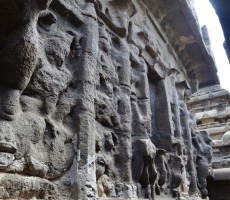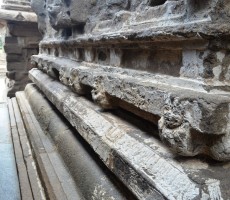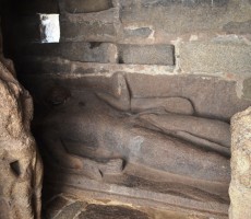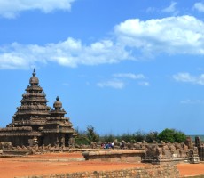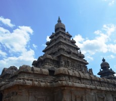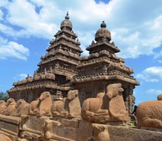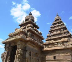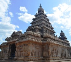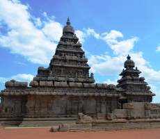 The two structural shrines Kshatriya Simhesvara (East) and Raja Simhesvara (West) collectively known as Shore temple and built by Pallava King Narasimha- Varman-II (Rajasimha) (AD. 700-728), mark the culmination of the architectural efforts which began with the cave temples and monolithic rathas. The east facing Kshatritya Simhesvara has a sanctum enshrining the Dharalinga and Somaskanda panel. The Chatustala vimāna Kshatriya Simhesvara with an incipient Gopura at the entrance and dvitala vimāna Raja Simhesvara are proportionate and adds rhythm to the whole temple complex. The reclining Vishnu in between the two shrines is carved out of bedrock and it is earlier the mandapas in the front of the Raja Simhesvara shrine is extant upto the basement. The entire temple complex is covered by prakara coped with nandis.