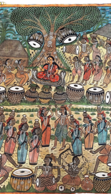 The Patachitra tradition of India is considered a vital folk art form of profound artistic expression that helps visualize different narratives through vibrantly painted scrolls. The art form is commonly practiced in the eastern states of India such as Bihar, Odisha, Jharkhand, and Bengal which are in close proximity to each other and share this artistic tradition, yet layered with distinct styles in technique, medium, themes, and subjects of their own. Amongst these many Patachitra traditions, the Bengal’s Patachitras, in particular, have achieved notable popularity, with regions such as Midnapore, Bankura, Birbhum, and Purulia becoming vibrant centres for the Patua or the Chitrakar communities to practice this traditional art form. Though one cannot exactly point towards the time and period when this art form started, however, oral history refers that it was in practice since the 10th and 11th century CE. Initially, patas were created out of leaf or cloth with the term “Patachitra” meaning painted clothes where “pata” means cloth and “chitra” means painting. However, with the easy availability of handmade paper, it has now become the primary medium for their artistic creations. Having incorporated the intangible aspects of performance art, this particular visual media has produced not only skilled artists but also versatile performers. The Patuas possess bardic qualities, composing lyrics and narrating stories while skilfully unfolding their scrolls as they travel from village to village. This unfolding, referred to as Pāt Khelan, is complemented by the recitation known as Pāter-Gān, which consists of three enriching stages: the story itself, and its glorification, followed by the introduction of the narrative.