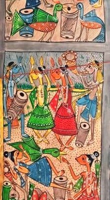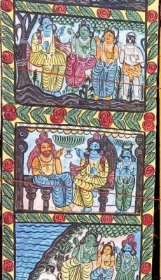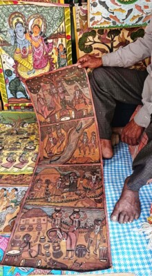 The Patua community in Bengal exemplifies cultural harmony, comprising Hindu and Muslim artists who collaborate and coexist, enriching the tradition with a hybrid Hindu-Muslim identity. This unique art form not only preserves the history and culture of the region but also serves as an important platform for social commentary and storytelling within the community. Traditionally, the Patuas performed their art in exchange for money or goods like grains and vegetables, which were vital for their livelihood. However, as the economy and socio-political landscape have changed, the art form has adapted and grown. Today, artists creatively transform this age-old craft into commercial products, including clothing and decorative items, which they sell to NGOs and various commercial entities, allowing them to earn a more sustainable income. They also actively perform at stages, fairs, and festivals, which help them get easy recognition within a broader audience. This evolution has not only strengthened their cultural identity but has offered new opportunities for innovation and livelihood.