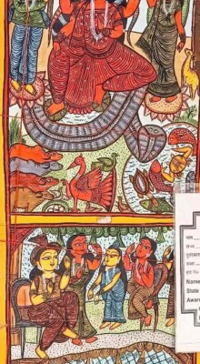 The themes of the Patachitras encompass Hindu epics, and mythologies, such as the Rāmāyana, Mahābhārata, and Purānas, alongside other significant works popular in Bengal, like the Mangal Kavyas. They also celebrate narratives of great saints, such as Chaitanya Mahaprabhu, and a few tales from Sufi traditions, thus reflecting diverse cultural influences. Moreover, the Patuas have embraced contemporary themes addressing socio-political realities and integrating social awareness issues into their art, addressing topics like female hygiene, rape, and health-related education. By doing so, they not only uphold the traditional Patachitra style but also contribute to the dissemination of vital information within their communities. In this vast ocean of myriad subjects depicted in Bengal’s Patachitra, the tale of “Mācher Biye,” or the “Wedding of the Fish,” stands out as one of the most recurring folktales narrated by the Patuas through their scroll paintings. This narrative adds a humorous perspective while highlighting the cultural significance of fish in Bengali society, featuring an array of fish varieties. The striking depiction of vibrant colourful fishes, and other aquatic animals, combined with elements of musical instruments and light-hearted humour creates a compelling experience for the audience. There are several versions of the narration with different Patuas creatively interchanging the names of the fish, but ensuring that the central context remains intact.