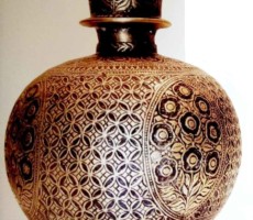 The design of this typical hukka base, especially popular in Lucknow and northern India, is of Mogul origin. It is cast in one piece and has intricate geometric and floral patterns (rose flower) created by incrustation. Both the in-going and the out-going pipes pass from the opening at the top.