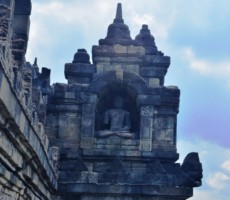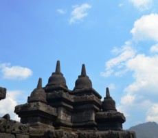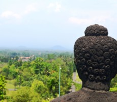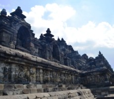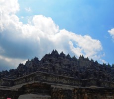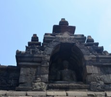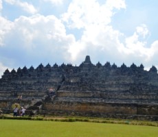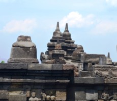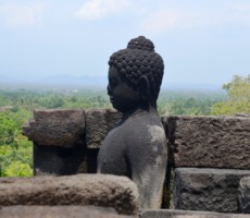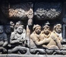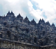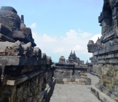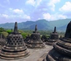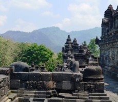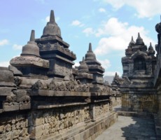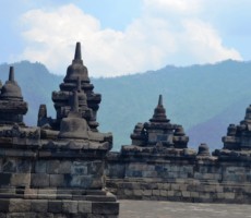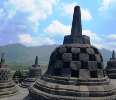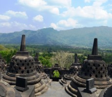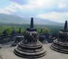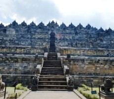 Borobudur, the famous Buddhist temple, dating from the 8th and 9th centuries, is located in central Java. It was built in three tiers: a pyramidal base with five concentric square terraces, the trunk of a cone with three circular platforms and, at the top, a monumental stupa.
