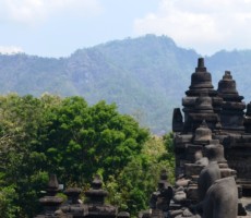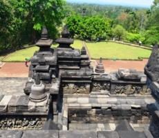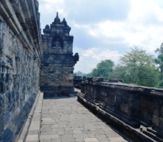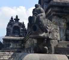 Chandi Borobudur or Ancient Borobudur is built on a long natural hill, the ridge of which was leveled and converted into a plateau. The main part of the plateau forms the site of the monument. The plain on the north-western spur of the hill provided the site for the monastery. The plateau is some 15 m higher than the surrounding plain, and the top of the hill rises about 19 m above the plateau. It is around and over the top of the hill that the monument is constructed. A considerable amount of fill was required, however, as the hilltop was not sufficient to serve as the core of the structure. Chandi Borobudur differs completely from the general design of such structures. It is not a building erected on a flat, horizontal base, leaving an inner space for the enthronement of a statue, but a stepped pyramid, consisting of nine superimposed terraces, and crowned by a huge bell-shaped Stupa. The building technique, however, is the same as that used in the construction of chandis in stone. The building material was not collected from quarries, but taken from neighbouring rivers. The stones were fashioned and cut to size, transported to the site, and laid without mortar. The stones are made to grip by means of dovetails in the horizontal connections, and indentations in the vertical joints. The use of a knob on one side of a stone that fits into a corresponding hole in the next is also very frequent. These arrangements allow a certain flexibility, so that the monument can withstand slight movements without undergoing any immediate danger of collapse. When building was completed, the carvings and other embellishments were added. The structural design is complicated but a main vertical division into three parts (base, body and top) is evident. The base forms a square with protuberances. The square itself measures 113 m x 113 m, the overall dimensions being 123 m x 123 m. The 4 m high walls of the base are supported by a foothold, resembling a huge plinth – 1.5 m high and 3 m across. The body or middle part of the monument is composed of five terraces, which diminish in size with height. As if to emphasize the changes from one part to another, the first of these terraces stands back some 7 m from the sides of the base, creating a broad platform right round the monument. The other terraces retreat only 2 m at each stage, and balustrades at the outer sides convert the narrow galleries into corridors. The superstructure is again clearly distinguished from the terraces. It consists of three re-entrant circular platforms, each of which supports a row of perforated stupas. Surmounting the rows of stupas, which are arranged in concentric circles, the central dome on top of the whole monument soars into the sky to a height of nearly 35 m above ground-level. Access to the upper part of the monument is provided by stairways in the middle of each side of the pyramid. Through a series of gates (most of which have been lost at each level), a stair leads directly to the circular platforms, at the same time intersecting the corridors of the square terraces. ‘The main entrance is at the eastern side (as is evident from the start of the narrative reliefs). Staircases are also found on the slopes of the hill, mounting from the lower-lying plain to the elevated plateau, and linking up with the stairways of the monument by means of paved ways. The entrances are guarded by stone lions; other lions watch at the different levels of the pyramid – a total of 32 lion statues in all. The builders of Chandi Borobudur realized the need for a drainage system because of the heavy rains. Spouts were provided at the corners of the mounting stages to drain off rain-water from the galleries. All of the 100 spouts are beautifully carved in the shape of makaras (gargoyles). As Borobudur is so different from all the other chandis in Indonesia it has often been suggested that it is a stupa and not a chandi at all. A stupa was originally intended as a shrine for relics of the Lord Buddha. Later, it is quite possible that the corporeal remains of distinguished Buddhist saints were enshrined in such stupas. Sometimes a stupa was erected merely as a symbol of the Buddhist creed. (p 14-16, Soekmono )