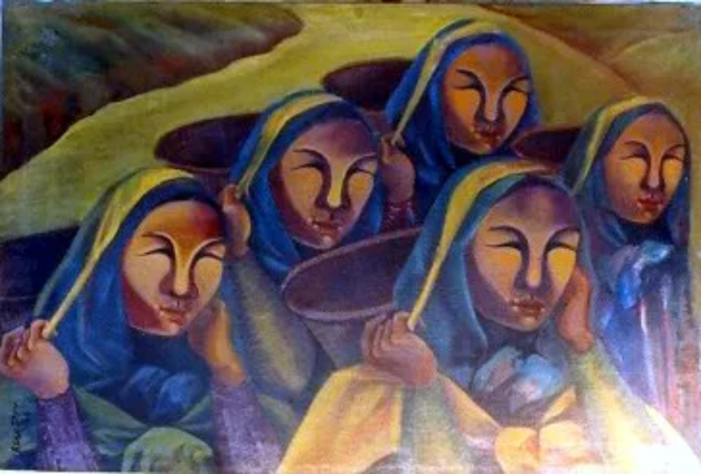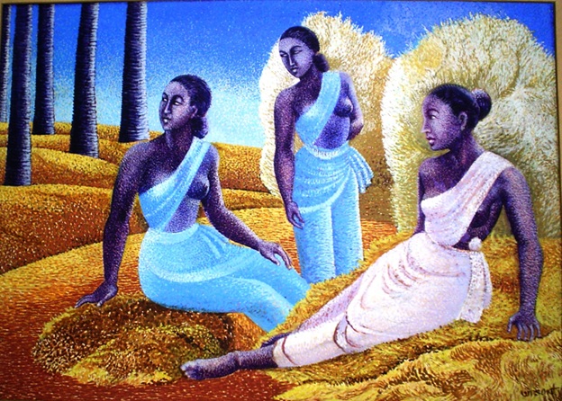 The subject matter of Deb’s work often included women from the Bodo, Kachari, Garo, Khasi, Naga, and Santhal communities within North East India; encouraging respect, support and acknowledgment for the valuable contributions made by all women through their perseverance that help maintain family, community, agriculture, and also sustain the nature. In his painting titled, ‘Santhal Virgins’, he paints three Santhal women posed beautifully within a serene rural setup showing the harvest season. The women have traditional clothing on, and because of their serene facial expressions and elegant poses, they appear completely harmonious with their environment. The use of dot-based textures adds a soft quality to both the women’s bodies with the traditional rural background creating an ethereal quality to the work. The woman’s harmonization with the rhythms of Earth is emphasized by the large expanse of harvested crops on the canvas. This arrangement evokes the connection between women and nature, where the abundance of the harvest represents fertility and sustenance, establishing her as a symbol of the generative qualities of Mother Earth.