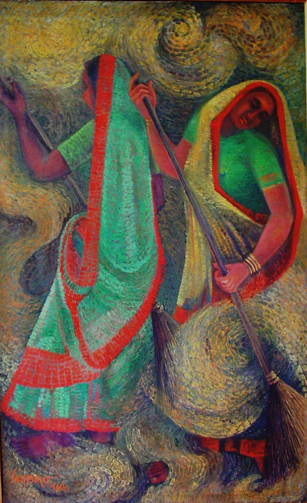 Another major painting by the eminent artists is titled as ‘The Harijan’, which portrays the lives of marginalized womenfolk, where two women from the Harijan community are shown fully dressed in their traditional ghagra, choli and odhni decently covering their heads, sweeping the dusty streets. The artists have diligently shown the two women engaged in the work which is associated with socially disadvantaged groups, but instead of relegating them as marginalized, they are positioned at the centre of the painting in vibrant green and red attire attracting attention of the viewer, showing their work and their dignity as working women of the society and bread-earners for their family. The waves of dust produced in the setting are created by dots and short lines in a circular fashion representing the clouds of dust created with the movement of their brooms. The action of the women within the background is complemented by the elements of the background creating a significant statement about the social situation as well as the existence of a great amount of labour that working women perform that often goes unnoticed.