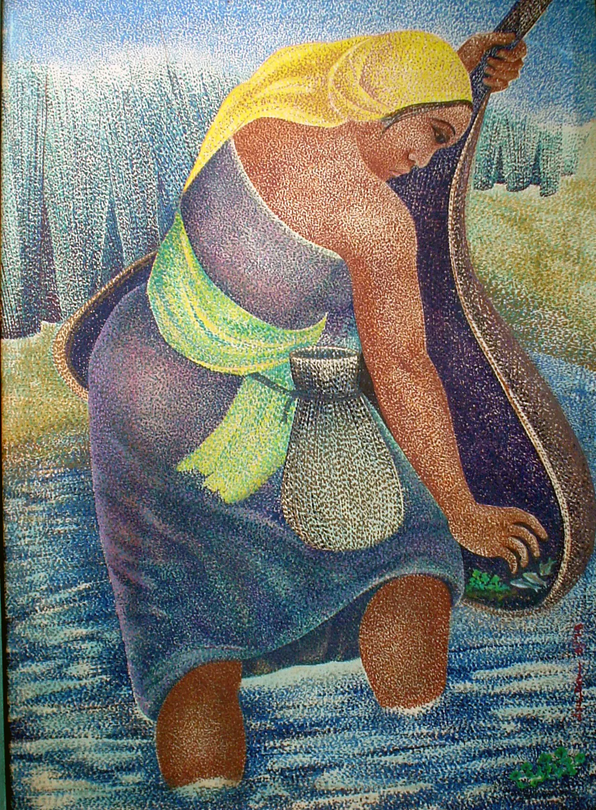 Asu Deb’s works are particularly known for his depiction of women from North-East India, belonging to different ethnic groups, as major subjects performing the everyday activities of their respective communities like fishing, harvesting, and tea plucking, weaving, etc. Although these activities might appear as regular or modest works, Deb represents the dignified nature of these daily acts, by demonstrating how the womenfolk create and maintain social relationships and keep the social structure of a community intact. In this way, Asu Deb’s representations of women acknowledge their often unnoticed but powerful influence on the cultural and social framework of society. He further depicts an interesting way of interpreting women in the way he handles the image of their bodies. He creates earthlike, rounded women figures that seem to naturally belong within the surrounding landscape, adhering to their ethnic roots. This visual unity between woman and earth illustrates the connection between woman, the earth’s life-giving and sustaining forces, and the continuum of life.